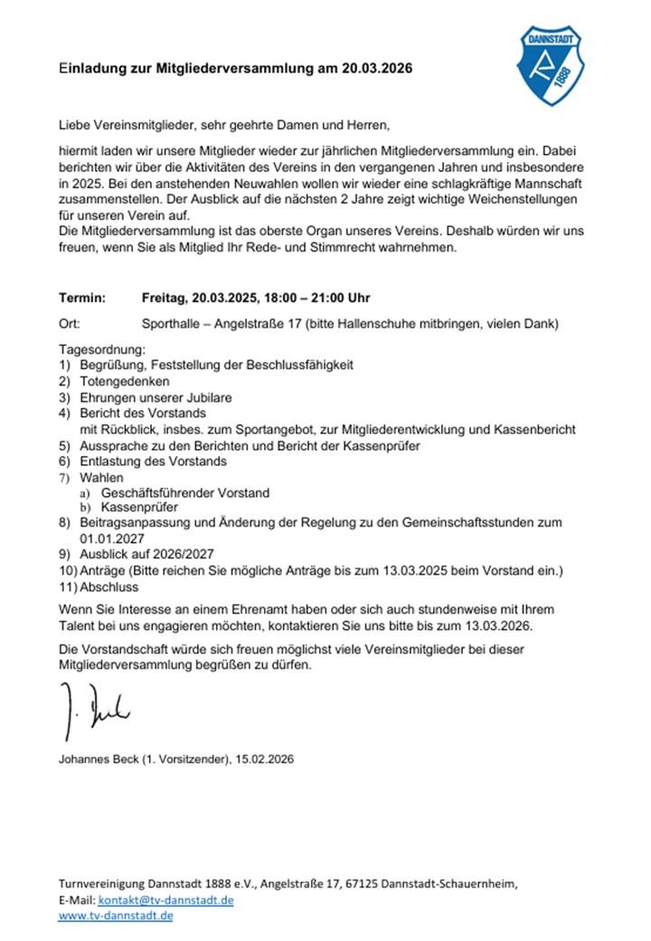 Aufgepasst! Unsere ordentliche Mitgliederversammlung 2026 rückt näher. Auf der Tagesordnung stehen u.a.: Neuwahlen des Vorstands, Infos zu Aktivitäten in den nächsten 2 Jahren, Beitragsanpassung und weitere interessante Themen. Nehmen Sie ihr Rede-und Stimmrecht wahr. Wir freuen uns eine rege Teilnahme.