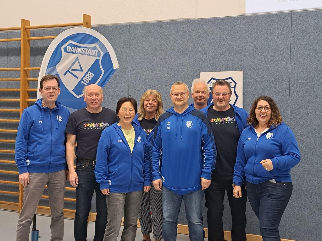 Der geschäftsführende Vorstand der TV Dannstadt 1888 e.V. mit vielen bekannten aber auch neuen Gesichtern. Im Bild von links nach rechts: Peter Mendera (2.Vorsitzender), Johannes Beck (1.Vorsitzender), Ye Gross -Zhou ( Vorstand Mitglieder-Service, Britta Heidger ( Vorstand Schriftführung & Dokumentation, der neue Vorstand Finanzen Deven Misra, Klaus Pajurek ( Vorstand Marketing & Kommunikation), Hubert Bachmann ( Vorstand Technik) und Claudia Radmacher ( Vorstand Event).